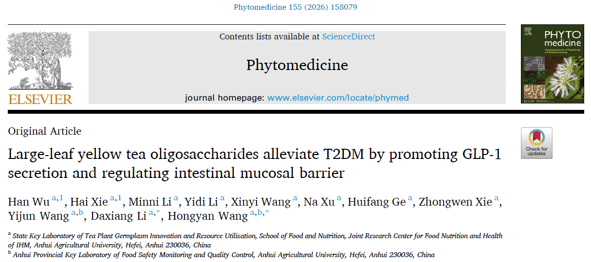 本网讯 近日,国际知名期刊《Phytomedicine》(T2,IF=8.3)在线发表了食品与营养学院王红燕老师题为“Large-leaf yellow tea oligosaccharides alleviate T2DM by promoting GLP-1 secretion and regulating intestinal mucosal barrier”的研究论文。该研究聚焦黄大茶特征活性成分的降糖功效与作用机制这一核心科学问题,从黄大茶多糖中分离鉴定出具有显著促GLP-1分泌活性的寡糖组分,系统揭示了其通过促进GLP-1分泌、维持肠道稳态降低血糖的分子机制,...