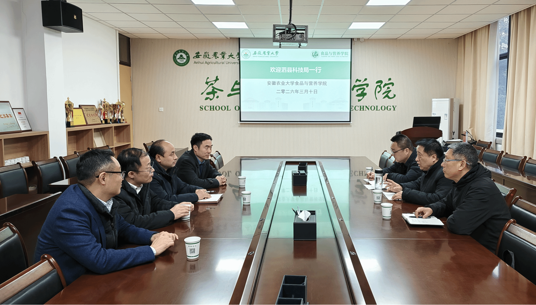 2026年3月10日下午,宿州市泗县科技局党组书记、局长吴韬,副局长苗霖韬一行3人来安徽农业大学食品与营养学院,就泗县金丝绞瓜深加工技术难题开展交流对接。食品与营养学院党委书记孙福、副院长梁进,园艺学院党委副书记程玉峰、副院长刘普参加座谈会。座谈会上,双方围绕金丝绞瓜营养成分挖掘、即食产品开发、副产物综合利用等关键技术问题进行了深入交流,希望在金丝绞瓜高值化加工、功能性产品开发、贮藏保鲜技术等方面开展深度合作,...