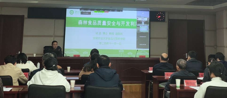 本网讯 2024年11月1日上午,安徽省林业局在省林业综合楼举办全省食用林产品质量安全监管工作培训班,会议由国际合作与林产业处副处长余波主持,采用线上和线下相结合方式进行。食品与营养学院副院长梁进教授应邀做了题为“森林食品质量安全与开发利用”的培训讲座,重点讲解了森林食品类型及产业现状、森林食品质量安全及管理、安徽林特食品开发与利用等方面内容,授课内容丰富,针对性强。
