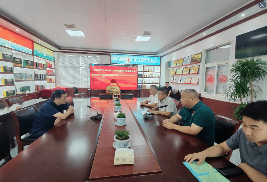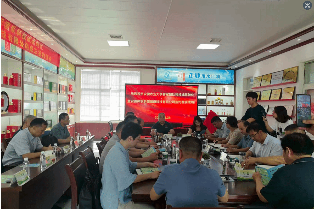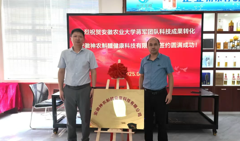 蒋军与安徽华韵酒业有限公司总经理王龙雨签署了科技成果作价投资协议,乔健与孙福共同为安徽神农斛醴健康科技有限公司揭牌。新公司注册资本440万元,重点开发石斛等道地药材健康产品。