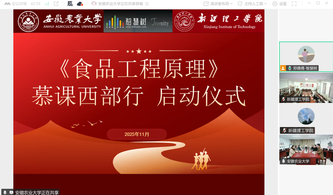 梁进在致辞中指出,慕课西行是促进教育公平、推动优质资源跨区域流动的重要举措。安徽农业大学《食品工程原理》持续深耕信息化教学改革,构建了包含智慧课程、微课资源、思政案例库的完整教学体系,于2025年获批国家级一流课程。此次与新疆理工学院携手,既是对“资源共享、优势互补”教育理念的践行,更是通过虚拟教研室建设,推动跨校教研从“内容共享”向“认知协同”升级的创新探索,将为两校食品学科高质量发展注入新动能。