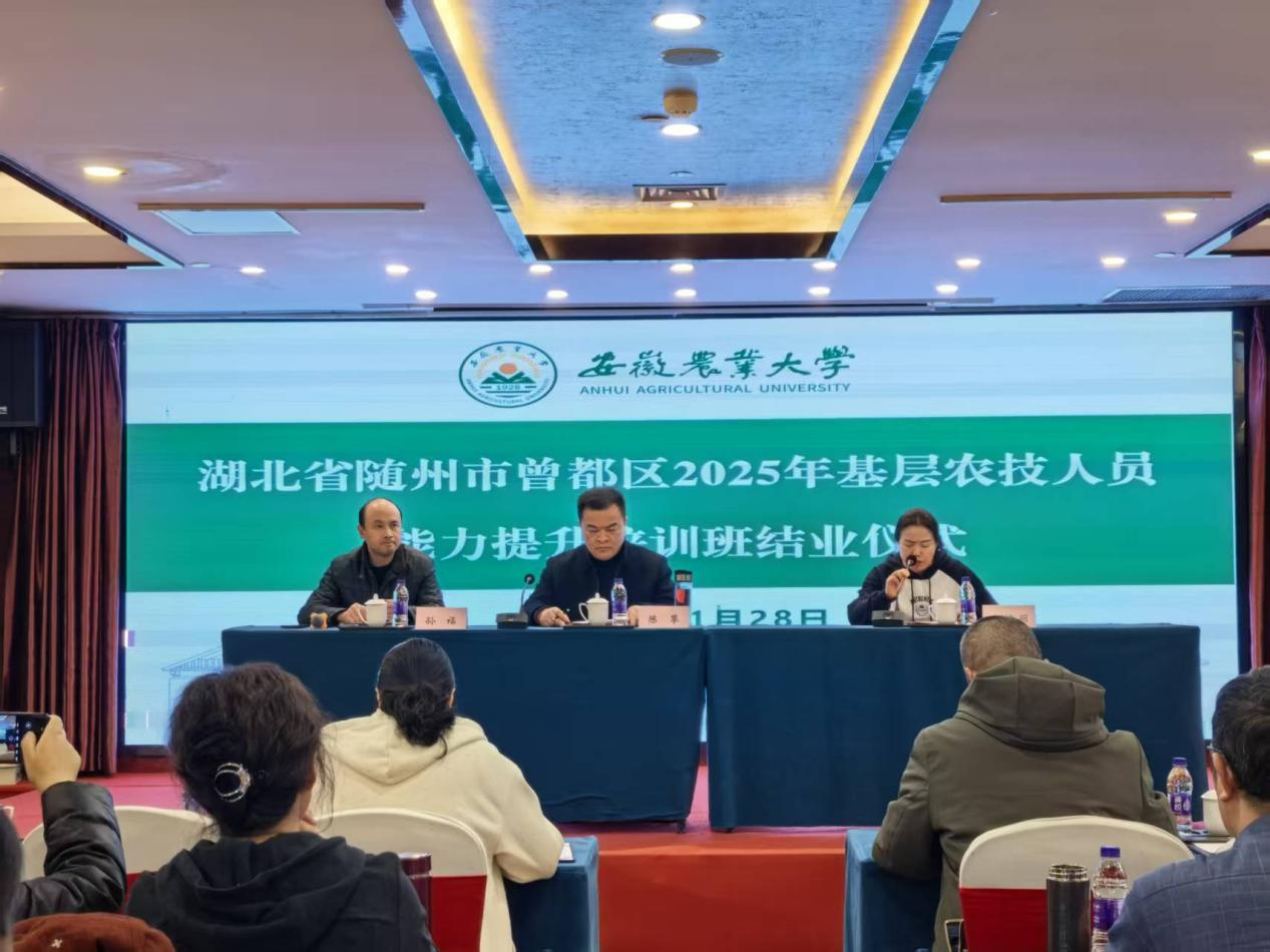 培训班结班仪式于11月28日上午在明发国际大酒店翡翠厅举行。安徽农业大学食品与营养学院党委书记孙福、曾都区农业农村局党组成员、农发办主任陈攀,出席并致辞。仪式由曾都区农广校校长王艳丽主持。