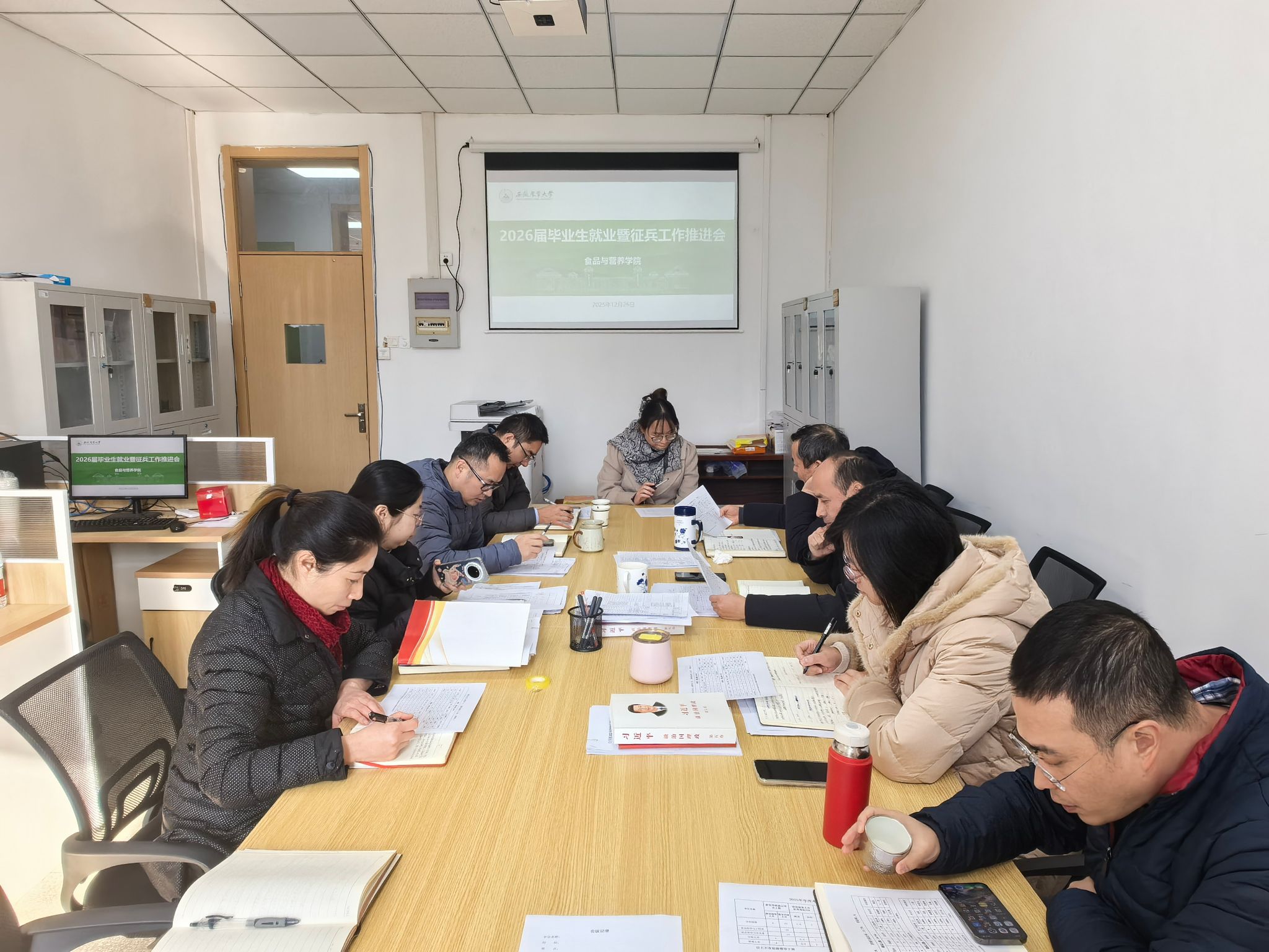 本网讯 12月26日上午,食品与营养学院在茶业楼415会议室召开2026届毕业生就业暨征兵工作推进会。学院就业工作领导小组全体成员参会,会议由学院党委书记孙福主持。